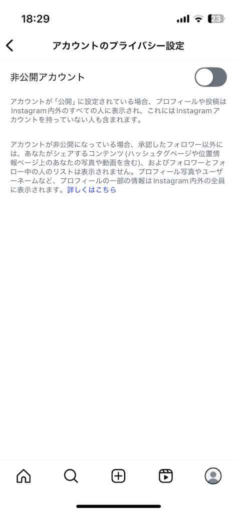 設定画面からアカウントのプライバシー設定を確認し、『非公開アカウント』のトグルがオンになっているか必ずチェックしましょう。