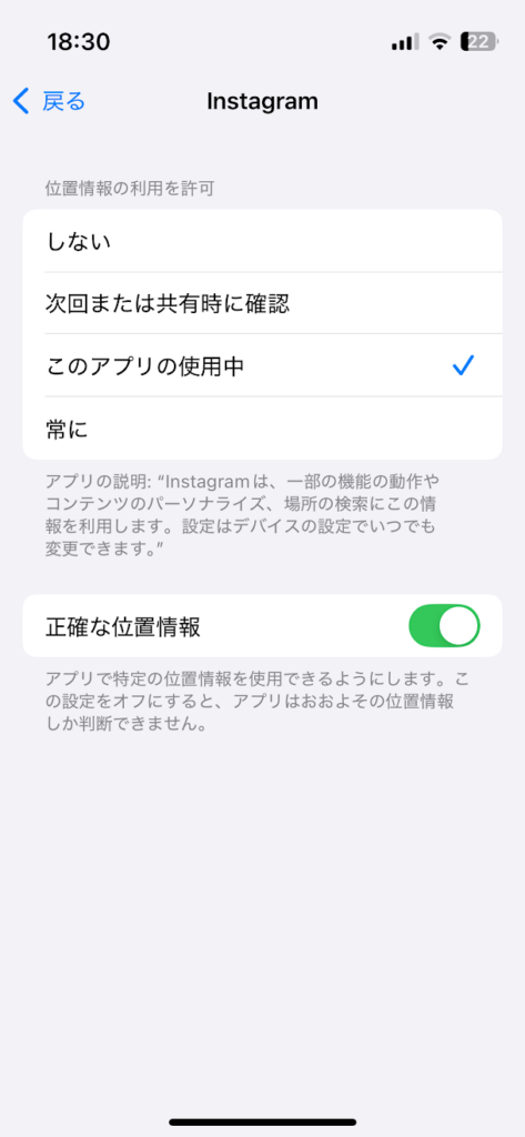 安全のため、スマートフォンの設定からInstagramを選択し、「位置情報」のアクセス許可を「なし」に設定しておきましょう。