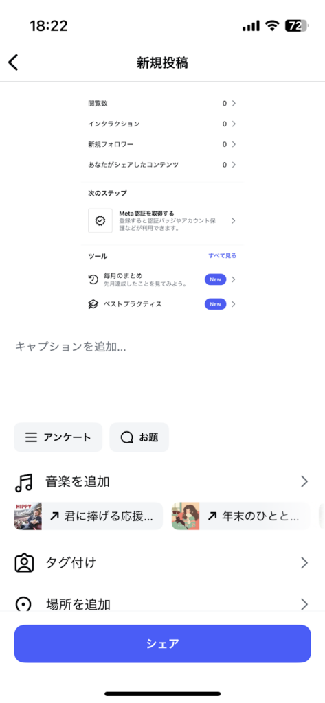 リールの下書きは、フィード投稿とは異なり、キャプションが未入力の状態でも動画素材として保存しておくことが可能です。
