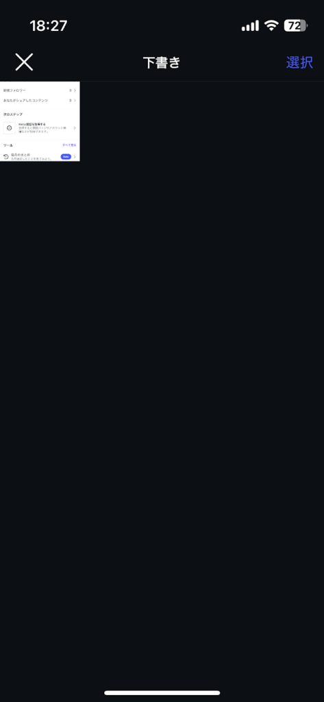 新規投稿画面の「下書き」タブを開き、画像の右側にある「選択」の文字をタップします。
