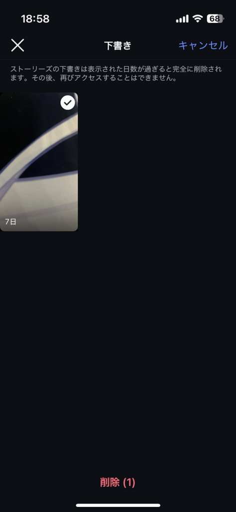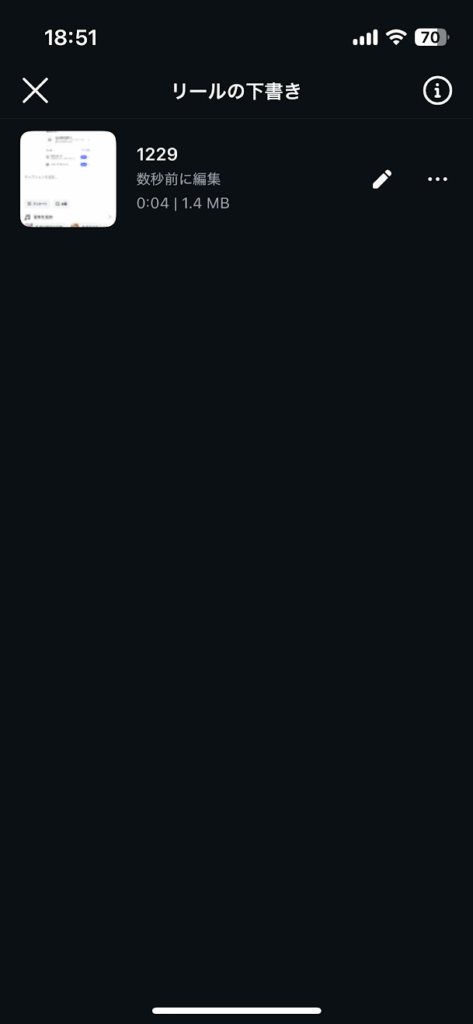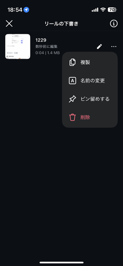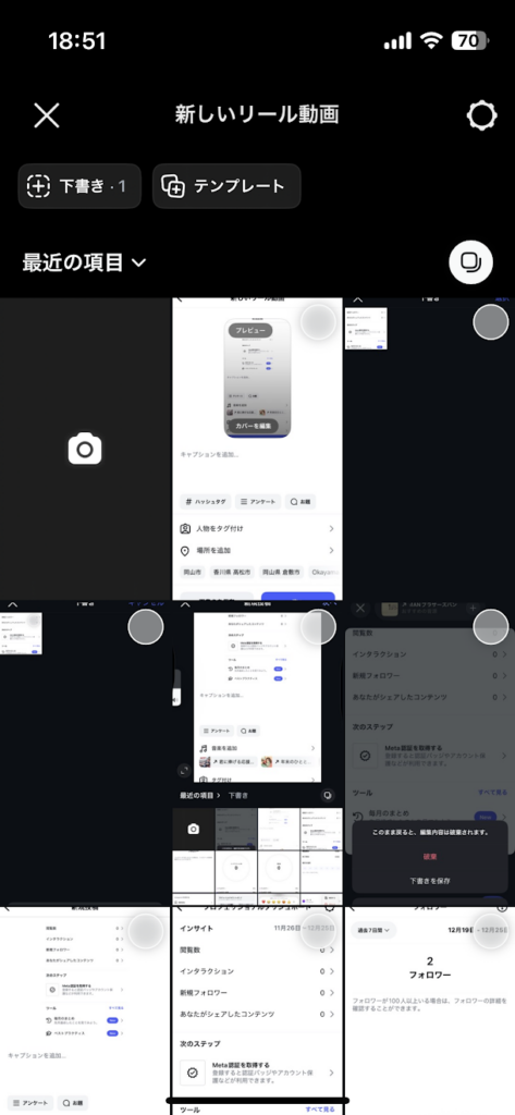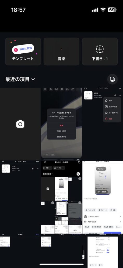 リールの下書きデータは容量を圧迫しやすいため、投稿済みのものや不要になった素材は定期的に削除して整理することをおすすめします。