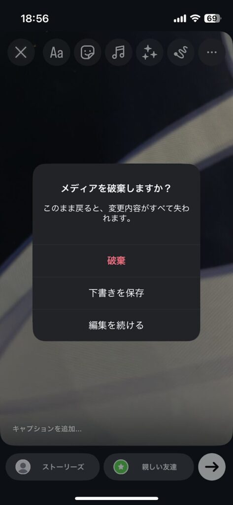 写真編集やキャプション入力の画面まで進み、左上の「<(戻る)」ボタンをタップし、続けて「✖️ボタン」をタップします。