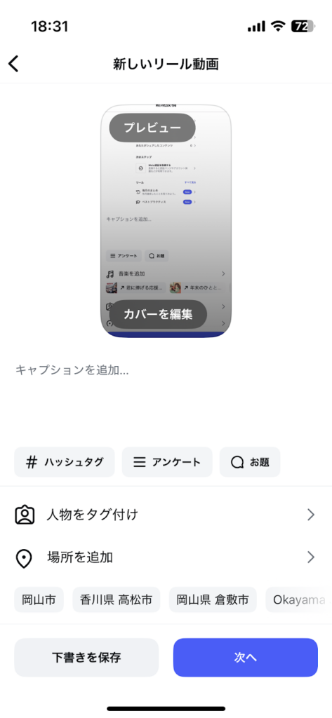 リール動画は編集に時間がかかるため、こまめに下書き保存を行うことで作業ロスを防げます。