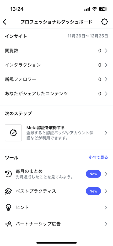 インサイト機能を利用するには、個人用アカウントから「プロアカウント(ビジネスアカウント)」への切り替えが必要です。