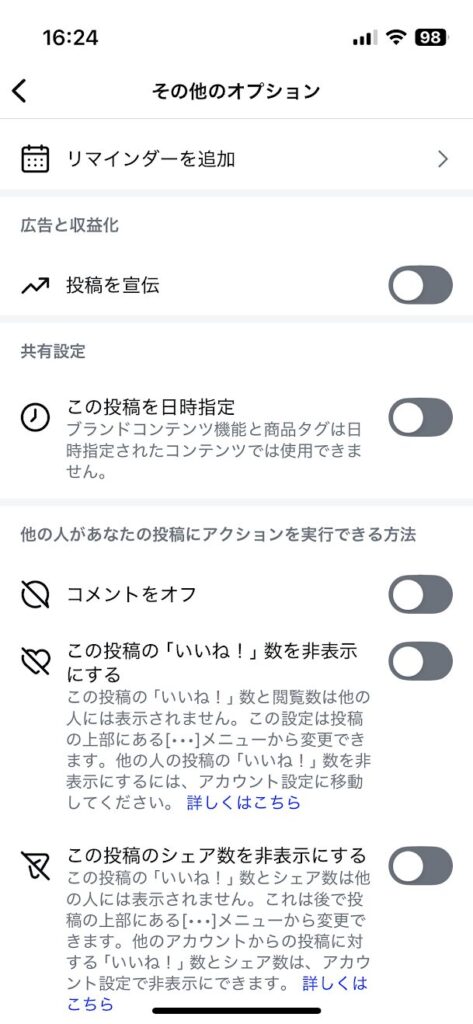 スマホアプリでの予約投稿は、新規投稿画面の「その他のオプション」内にある「この投稿を日時指定」をオンにすることで設定できます。