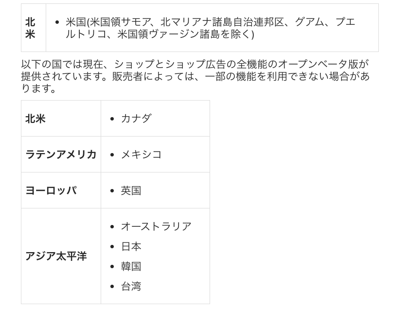 機能を利用するためには、ビジネスの拠点(会社や個人の住所)が、Meta社が指定する「ショッピング機能対象国」のリストに含まれている必要があります。