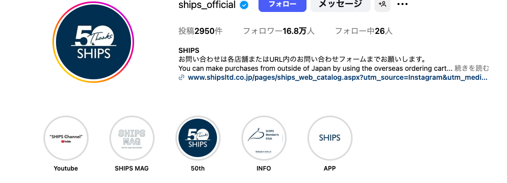 セレクトショップのSHIPSは、スタッフやモデルによる着こなしスナップを中心としたコンテンツ展開で、ユーザーとの間に親近感を演出しています。