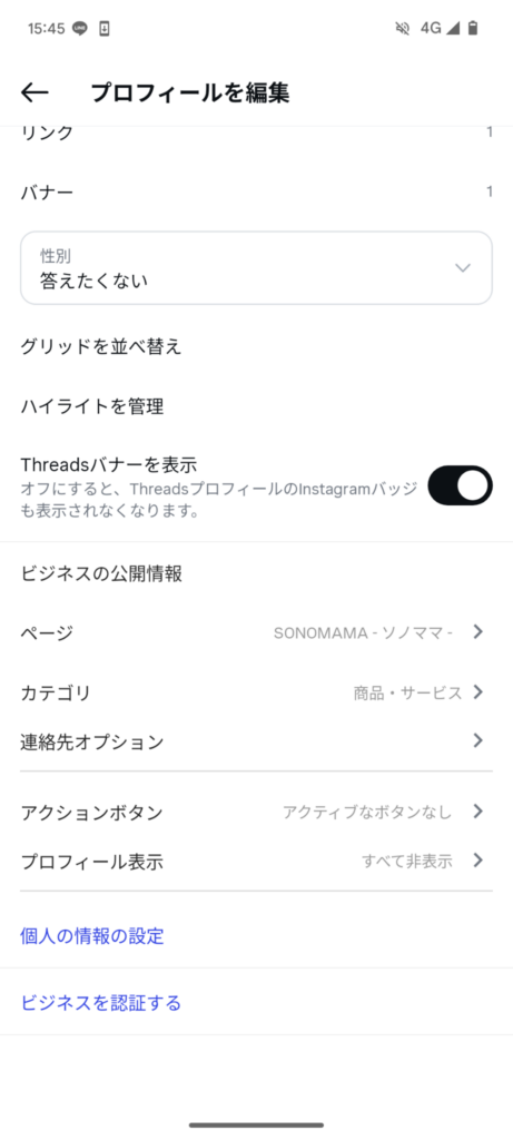 連携できているかどうかは、プロフィールを編集→下のほうにスクロールして「ビジネスの公開情報」の「ページ」