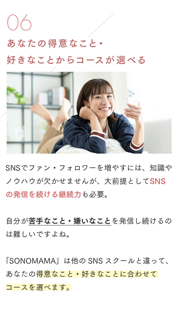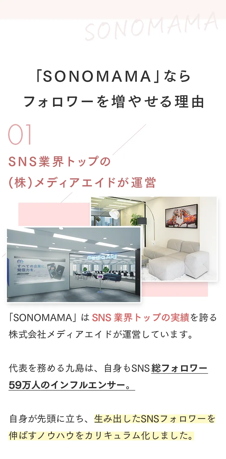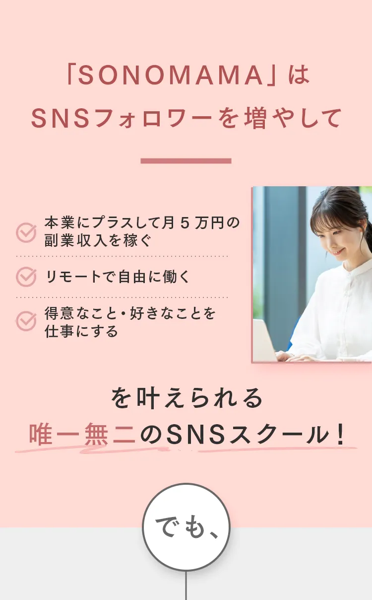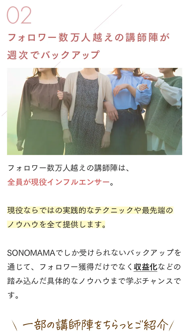 「SONOMAMA」は未経験でも十分に フォロワーを増やすノウハウと知識を 学べるカリキュラムと環境を用意して います。