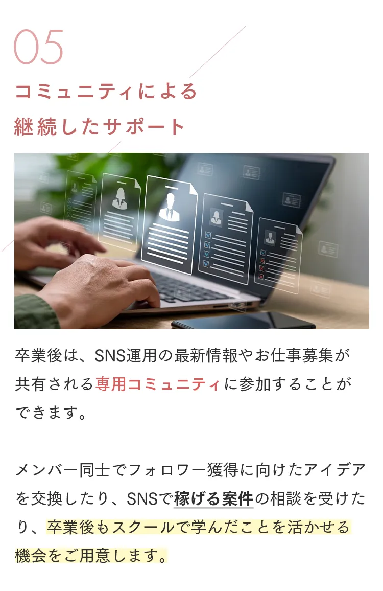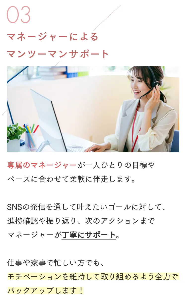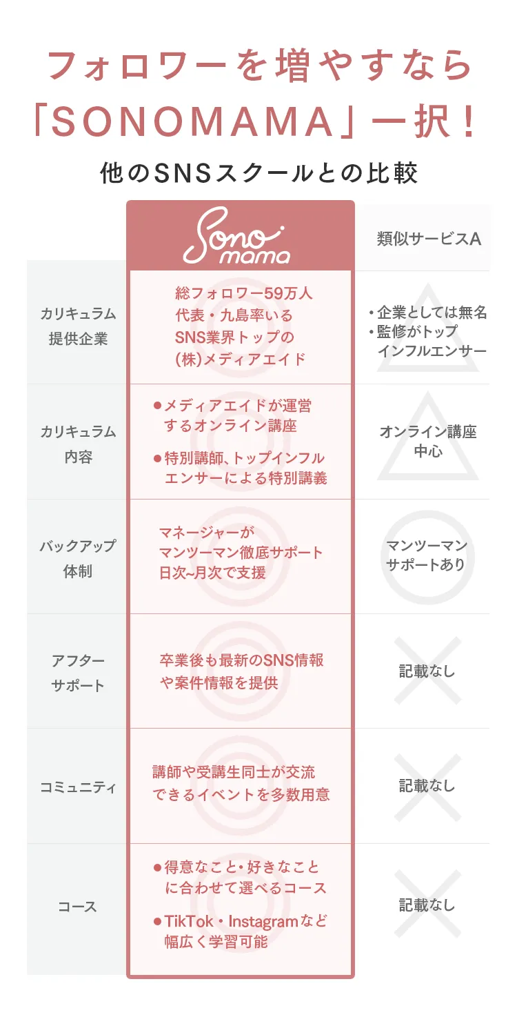「SONOMAMA」は他のSNSスクールと違ってマンツーマンのバックアップや卒業後のアフターサポートが充実しています。